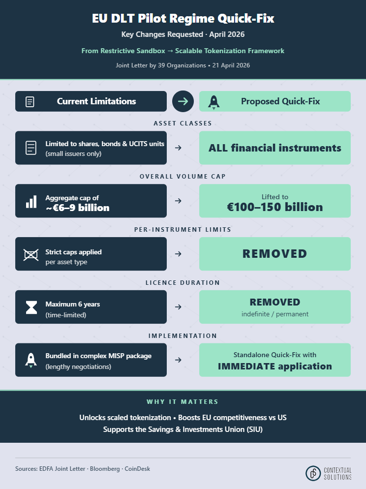 Five concrete demands sit at the heart of the new letter. The signatories want the eligibility restriction on asset classes removed entirely so that all financial instruments can be tokenized under the regime, the volume cap lifted to between one hundred and one hundred and fifty billion euros, per-instrument limits deleted, the time limitation on licences scrapped and the law to apply immediately on entry into force without a transition period. None of these are radical. They are, in essence, the existing Commission proposal stripped of its bundling and put on a faster legislative track.