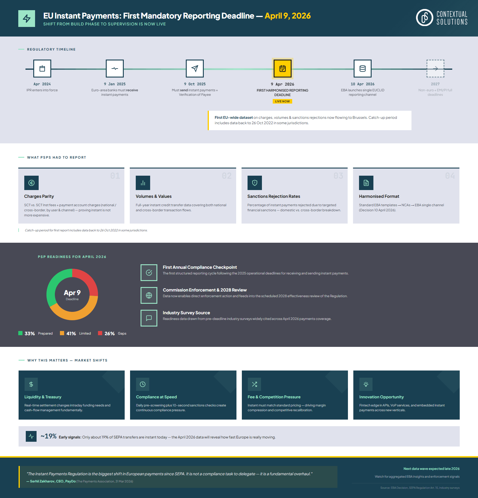 Last Wednesday, April 9, marked a quiet but consequential moment in European financial regulation. Every payment service provider operating in euro credit transfers, from multinational banks to lean fintech e-money institutions, was required to submit its first standardized annual report to national regulators under the EU Instant Payments Regulation. The filing itself was technical, dry, rendered in XBRL-CSV templates. Its implications are anything but.