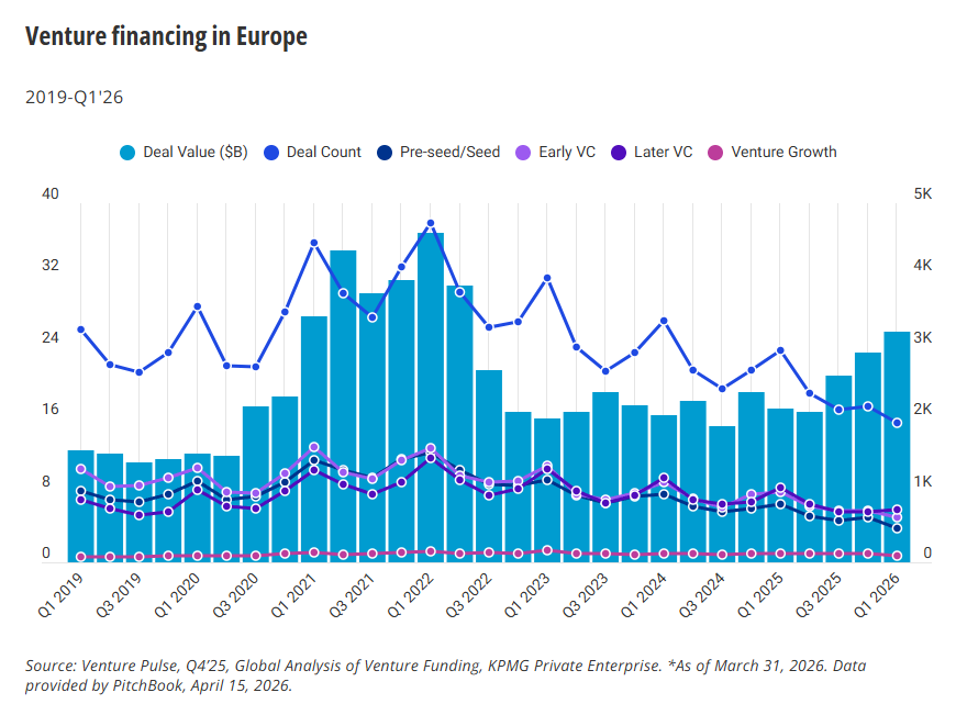 Crunchbase's Gené Teare, who has been tracking the European market through its long cyclical slump, observed in her Q1 analysis that the quarter's totals were "well above the prior five quarters by funding amounts, signaling that European venture funding may be gaining momentum." That is a careful way of framing what the data increasingly suggests: the recovery is real, and it is being driven by the same forces reshaping venture globally rather than by any peculiarly European dynamic.