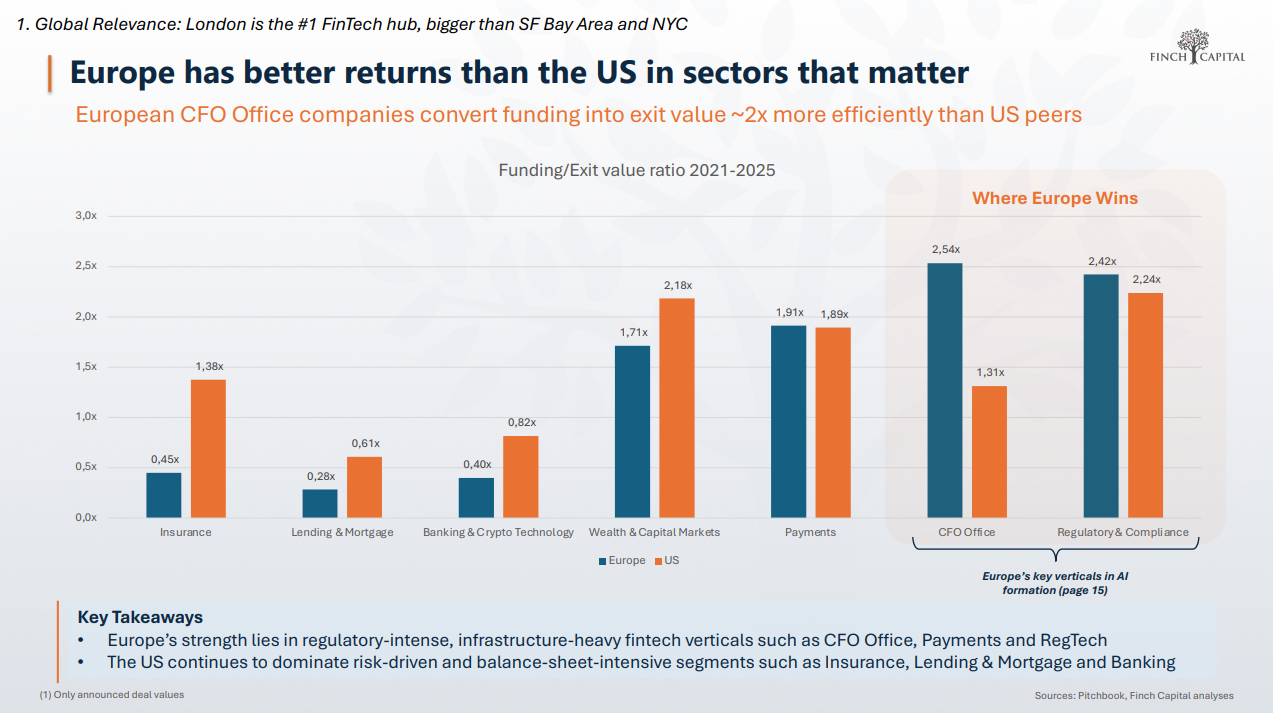 The Q1 2026 data suggests the compounding is accelerating. Europe saw 273 fintech deals raising $3.7 billion in the quarter, with capital flowing into payments infrastructure, embedded finance, SME lending, and RegTech. Analysts at Finch Capital note that in capital-efficient, regulation-heavy segments such as CFO office software and compliance tools, European firms generated 2.54 times returns on invested capital between 2021 and 2025, roughly double the 1.31 times posted by American peers. The places where European fintech wins are the places where regulation and operational depth matter more than growth-at-any-cost. That is not a fashionable verdict in a market obsessed with frontier AI, but it is a durable one.